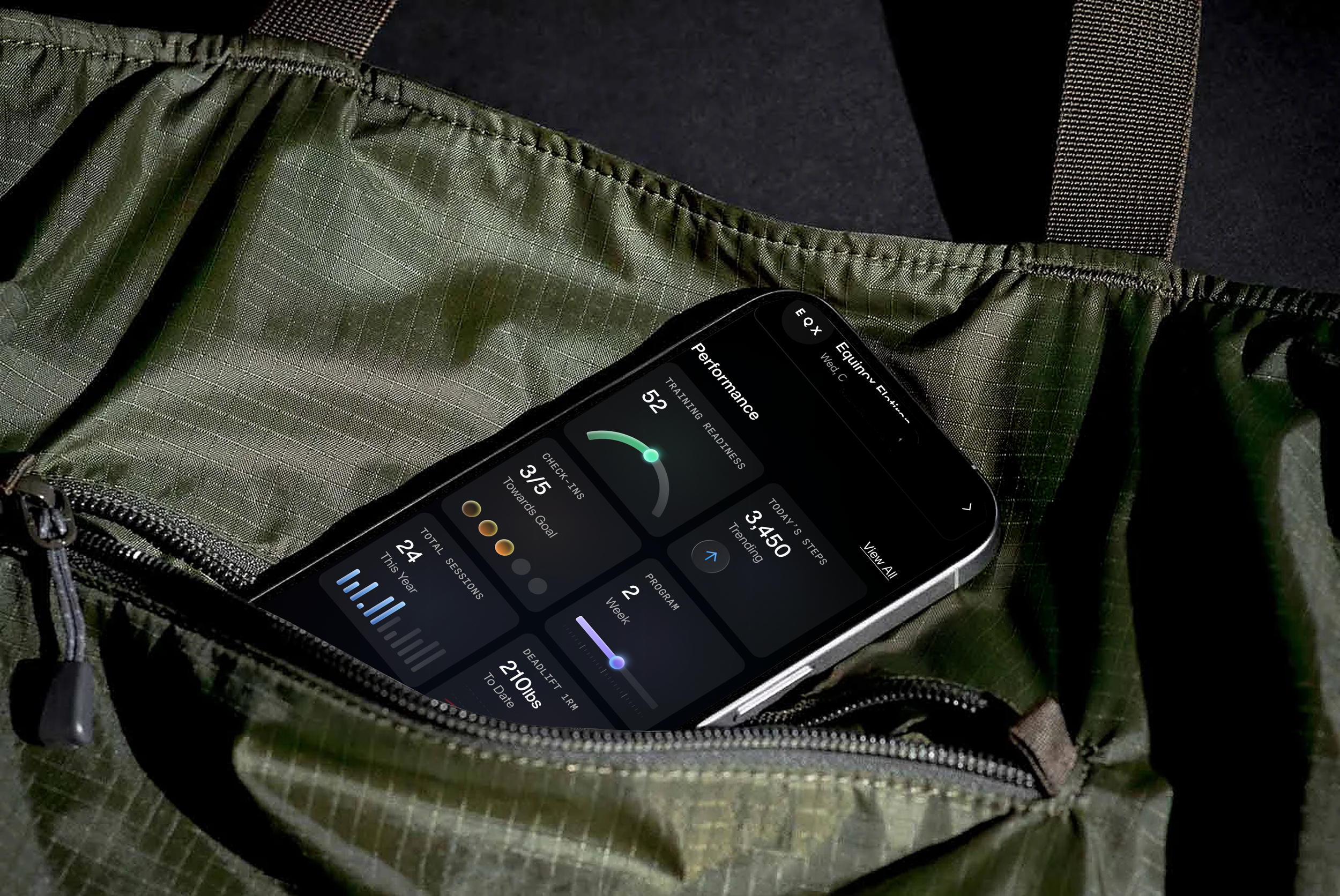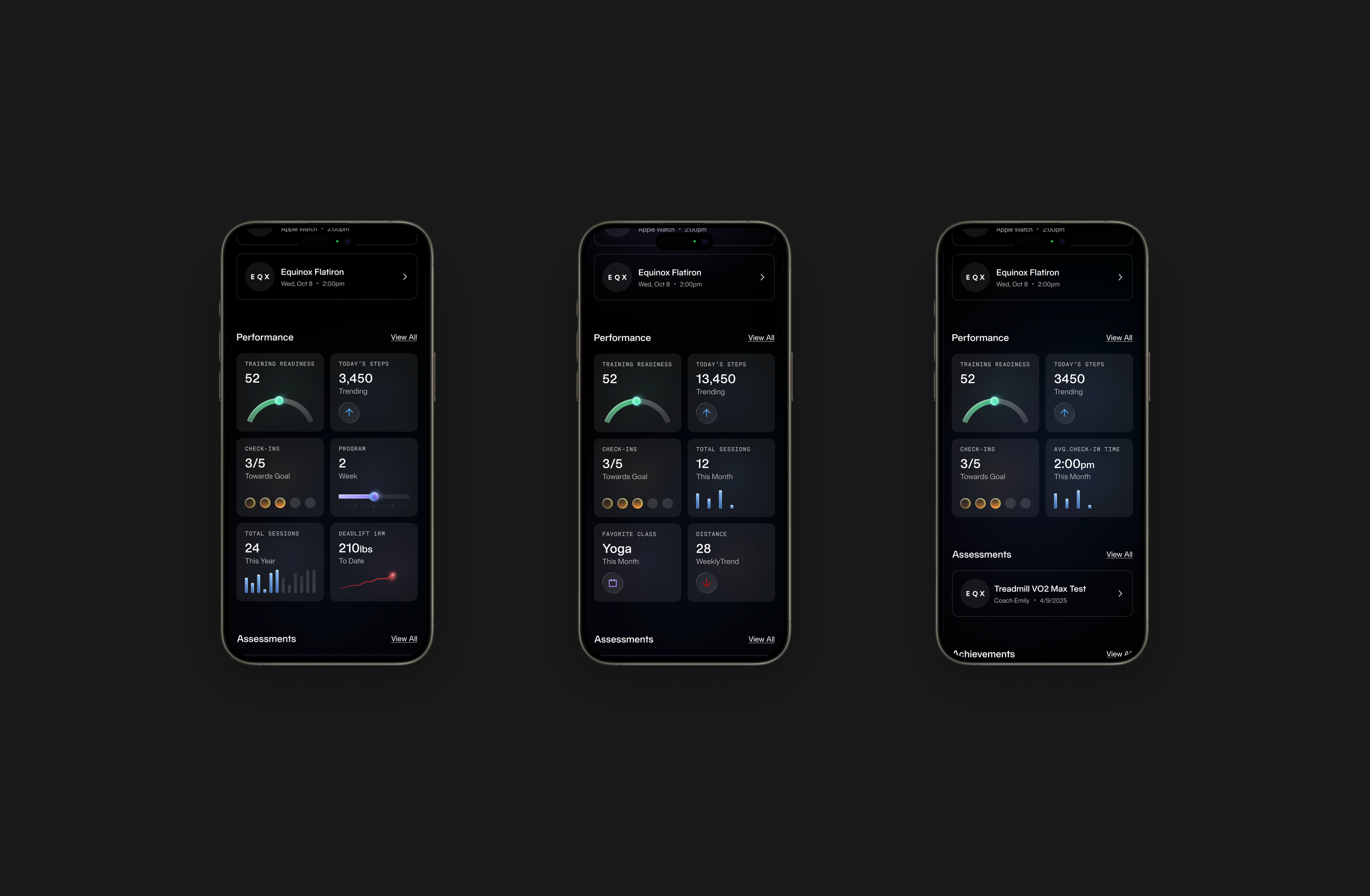The interface uses a dark, high-contrast foundation with subtle gradients and glow to elevate key metrics. Color is used intentionally to signal status and progress, while careful spacing and typography maintain clarity across dense data—creating a focused, premium experience aligned with the Equinox brand.