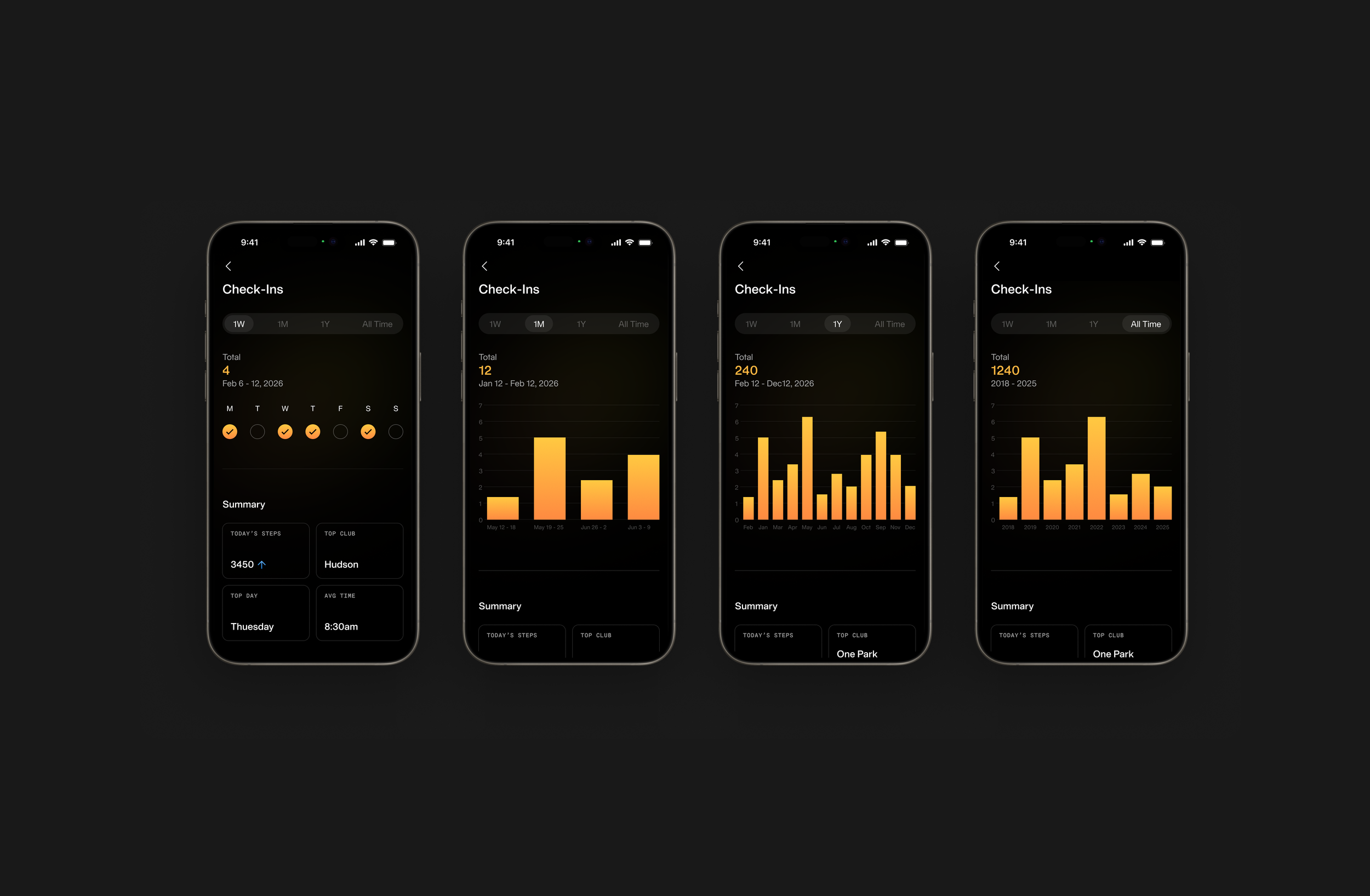 The check-ins detail view extends the activity experience by connecting high-level trends with deeper context. Users can move seamlessly across time ranges—weekly, monthly, and yearly—while visual charts surface patterns and consistency at a glance.