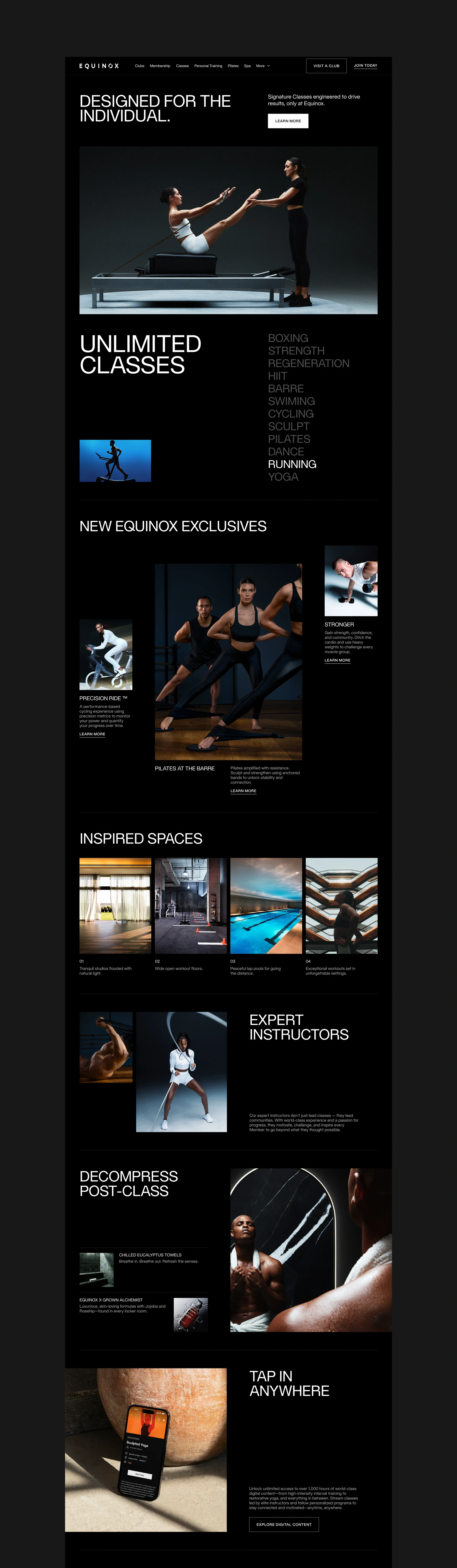 The homepage was designed as a narrative entry point that introduces the Equinox brand while guiding users toward key actions such as exploring clubs, classes, and membership. The structure follows a storytelling flow, starting with emotional, brand-driven content and gradually transitioning into more functional sections like club discovery, membership value, and conversion. Visually, the layout uses large imagery, bold typography, and a strong grid to create a premium, editorial feel, while modular content blocks create rhythm and help users move through the page without feeling overwhelmed.