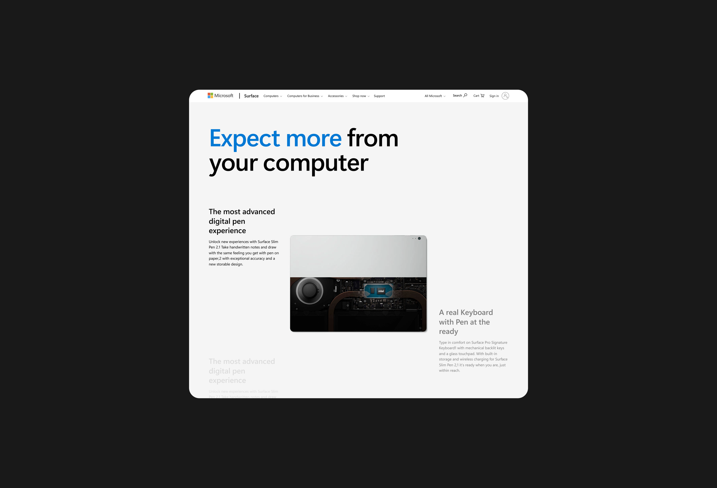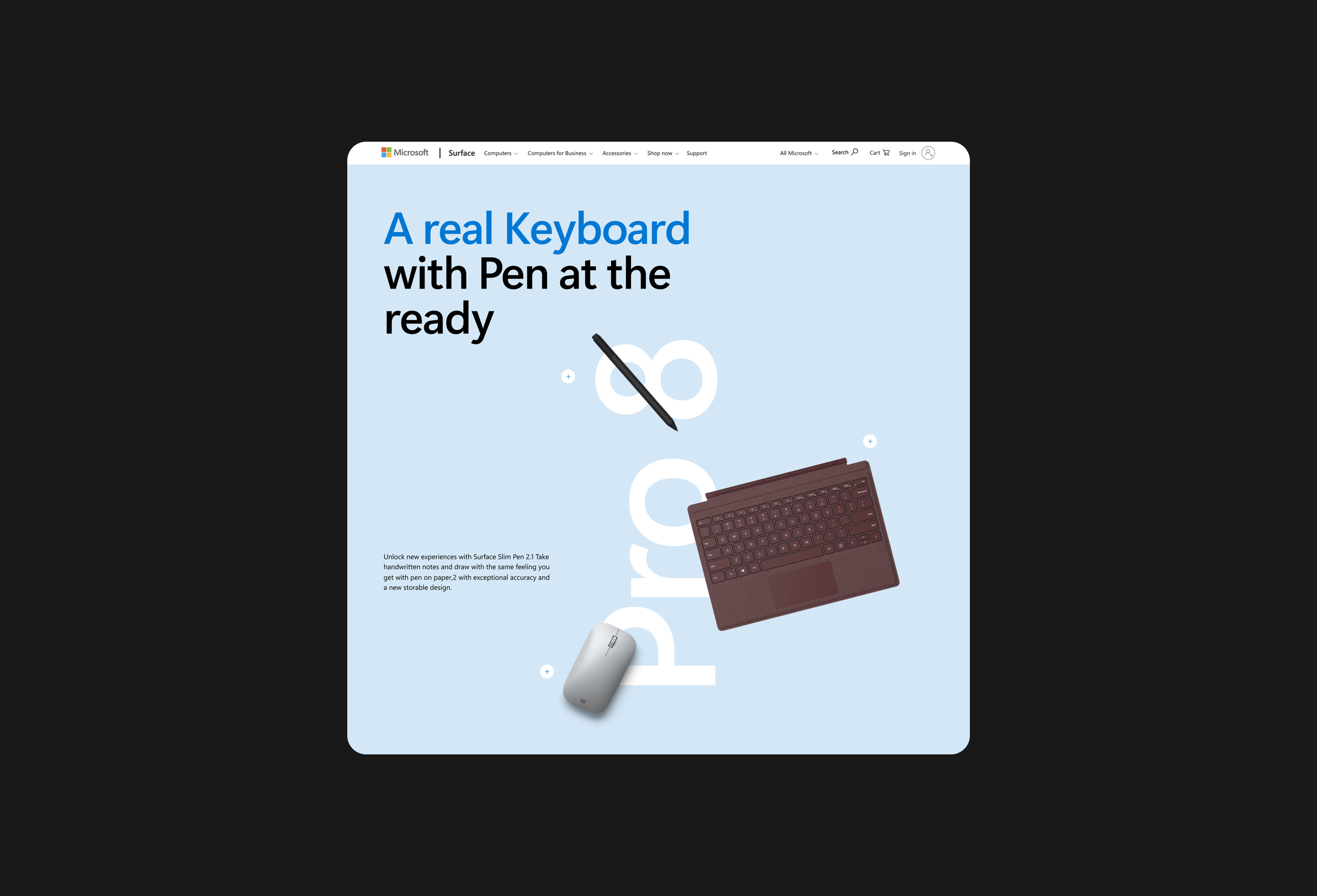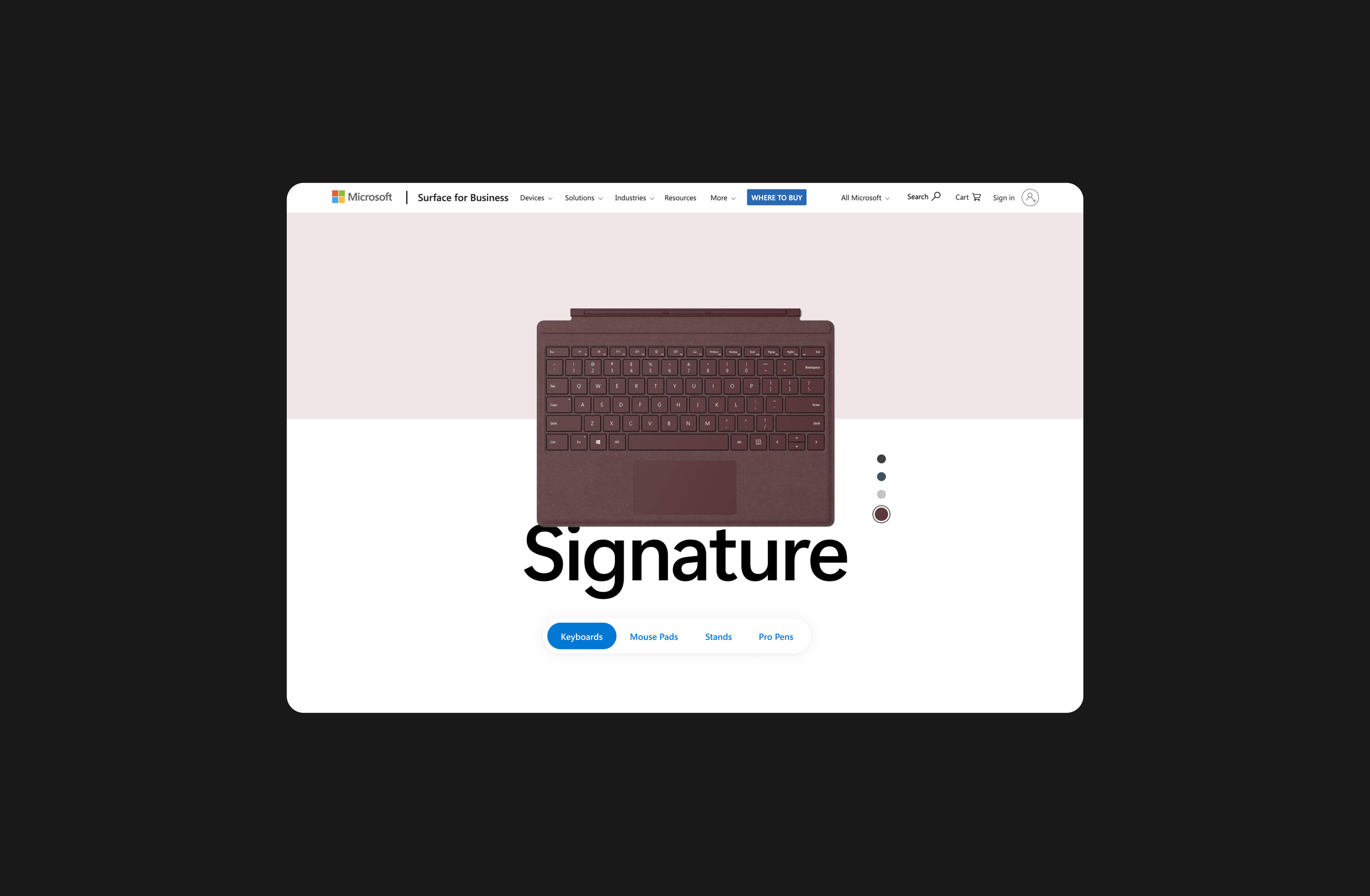 This screen introduces the Signature Keyboard as part of the Surface ecosystem rather than as a standalone accessory. The layout centers the product in a calm, minimal environment, allowing material, color, and form to become the primary visual focus. Large typography anchors the composition and creates a clear entry point, while the soft background split helps separate product navigation from product storytelling. The overall composition is intentionally quiet, allowing the product to feel precise, tactile, and premium