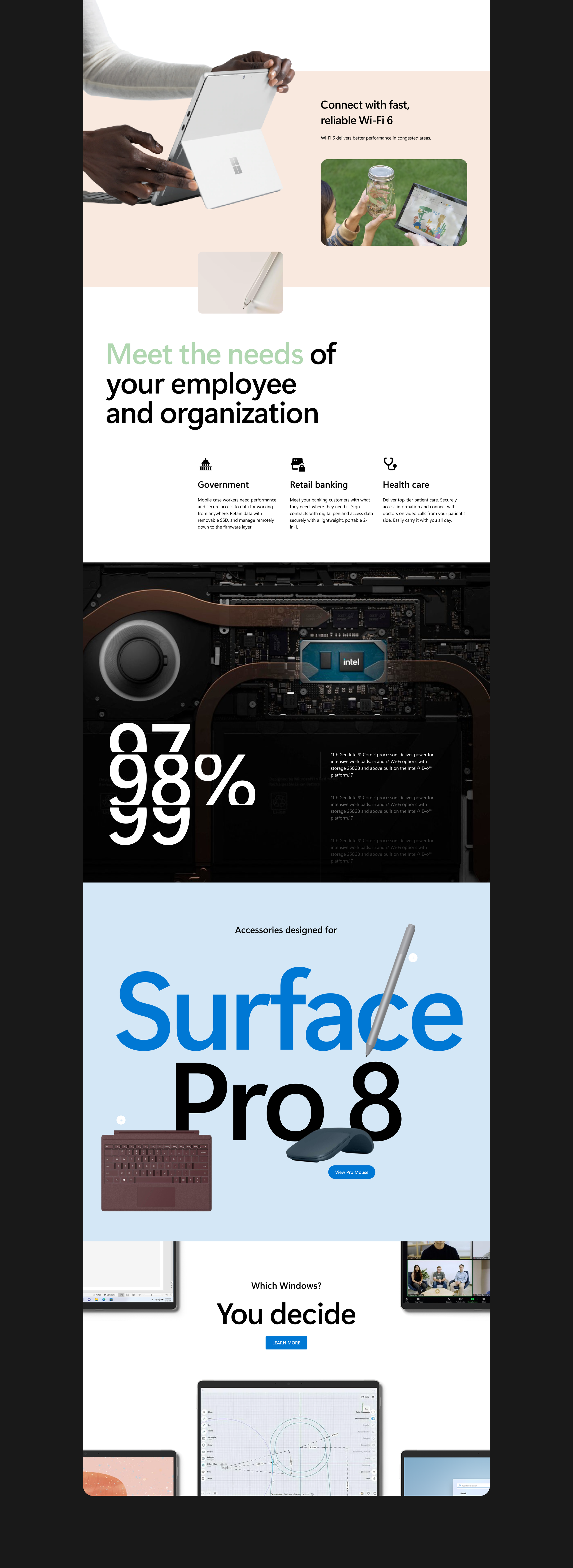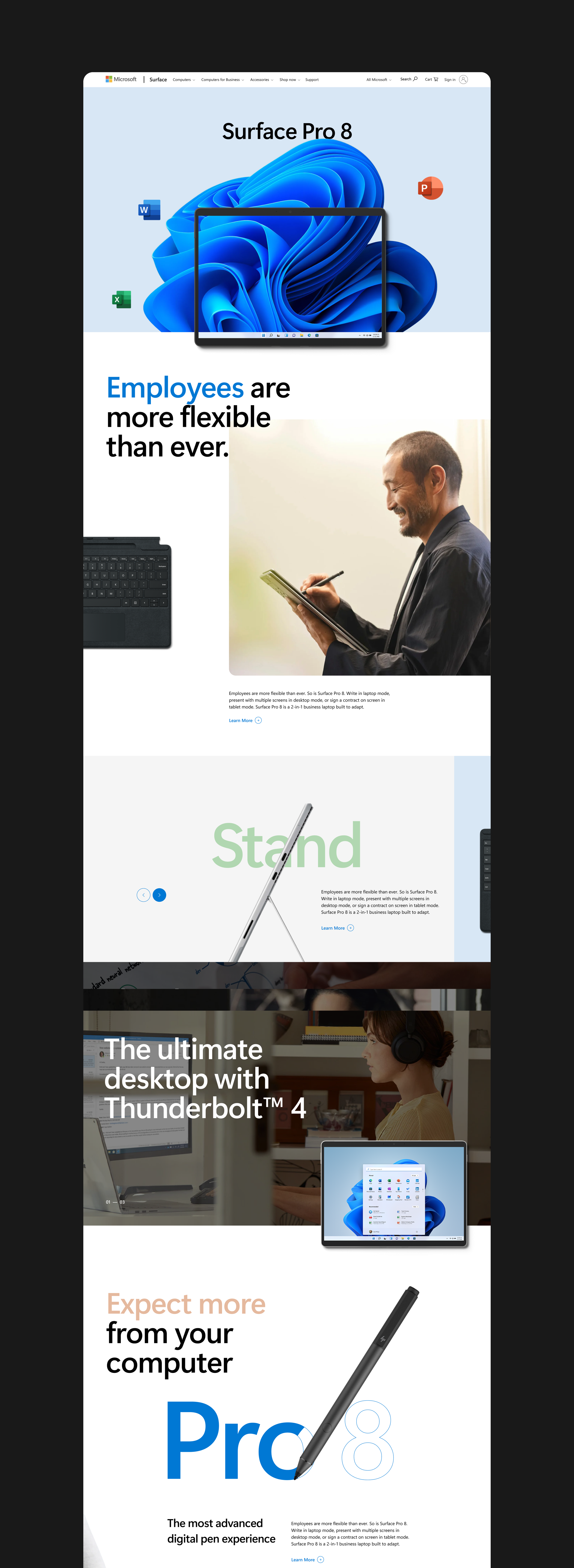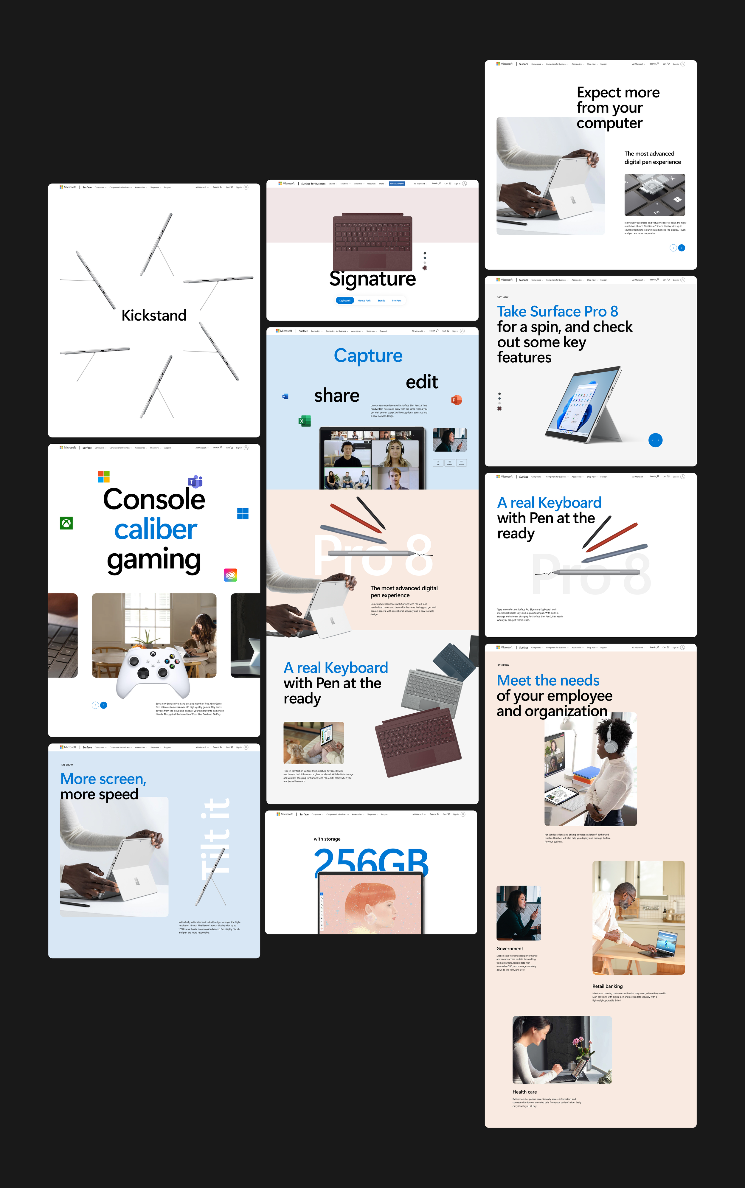 This project focused on designing a product storytelling experience for Microsoft Surface that communicates hardware innovation through a visually driven digital narrative. The goal was to translate technical product features into a clear, engaging web experience using layout, typography, motion, and composition as primary storytelling tools. The experience combines product marketing with interactive storytelling, allowing users to explore features, understand use cases, and discover the broader Surface ecosystem through a cohesive visual system.