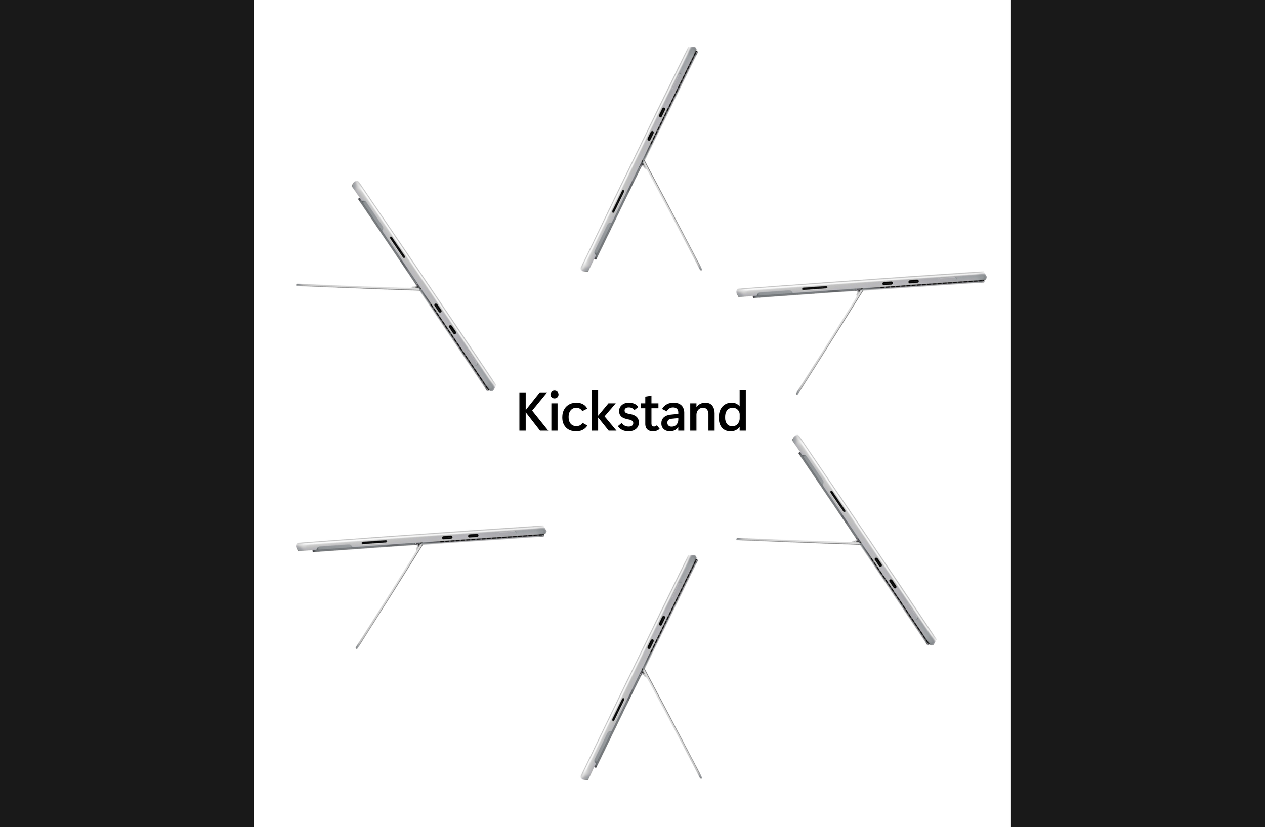 The Kickstand section focuses on form and engineering through repetition and motion. Multiple device positions are arranged radially to visually communicate flexibility and range of motion without relying on heavy text. The composition turns a functional feature into a visual story, where the product itself becomes the graphic element. The minimal layout and generous negative space help emphasize precision and industrial design quality.